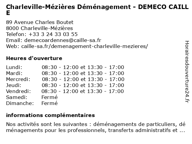 1 Demeco (Distance: 0,01 km) 89-91 avenue Charles Boutet, 08000 Charleville-Mézières apparts, demeco, demenagement, garde-meubles, location, maison, meubles 2 CarGo (Distance: 2,40 km) 18 Rue Jules Lobet, 08000 Charleville-Mézières camion, camion de déménagement, cargo, fourgonnette, location de voitures |