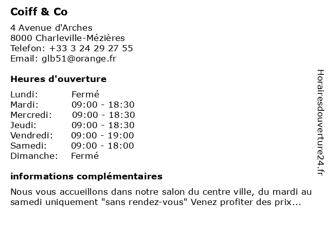 2 Basilic & Co - pizzas de terroirs (Distance: 0,93 km) 30 Cr Briand, 08000 Charleville-Mézières basilic, co, de, fast-food, pizzas, terroirs 3 Cosy And Co (Distance: 1,39 km) 32 Place Ducale, 08000 Charleville-Mézières and, boissons, café, co, cosy, restaurants, restauration 4 Frites And Co (Distance: 1,49 km) 14 Place Ducale, 08000 Charleville-Mézières and, bar, bistro, bistrot, brasserie, café, co, frites, restaurant, restauration 5 Coiff&Co (Distance: 1,79 km) 197-199 Avenue Carnot, 08000 Charleville-Mézières beauté, cheveux, coiff&co, coiffure, esthétique, salon, soins 6 Tom&Co Charleville (Distance: 2,63 km) Rue Paulin Richier, 08000 Charleville-Mézières alimentation pour animaux, animalerie, animaux, aquarium, arbre à chat, charleville, chat, chien, croquettes, lapin, litière, poisson, reptile, salon de toilettage, toilettage, tom&co |