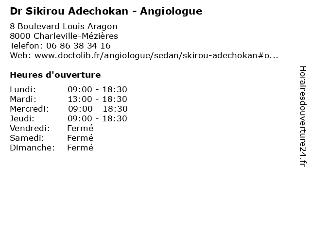 1 Dr Sikirou Adechokan - Angiologue (Distance: 16,45 km) 5 Rue Berthelot, 08200 Sedan adechokan, angiologie, angiologue, dr, sikirou, vaisseaux, vasculaire 2 Dr Julien Morin - Chirurgien vasculaire (Distance: 0,42 km) 226 Avenue Carnot, 08000 Charleville-Mézières chirurgie, chirurgien, dr, general, julien, morin, soins, vasculaire 3 Medecin Jean François Leclet (Acupuncteur) (Distance: 0,56 km) 49 Ferroul, 08000 Charleville-Mézières acupuncteur, docteur, françois, jean, leclet, medecin, sante, services 4 Medecin Dominique Leveque (Acupuncteur) (Distance: 1,35 km) 49 Avenue Carnot, 08000 Charleville-Mézières acupuncteur, docteur, dominique, leveque, medecin, sante, services 5 Résidence Docteur L'Hoste - emeis (Distance: 1,46 km) 33 Avenue Jean Jaurès, 08000 Villers-Semeuse accompagnement, activités, bien-être, chambre, confort, convivialité, docteur, ehpad, emeis, infirmière, l'hoste, maison de retraite, médecin, médicalisée, personnes âgées, psychologue, qualité, restauration, résidence, senior, soignants, soins, villers semeuse, échanges intergénérationnels 6 Medecin Aude Sabatier (Médecin généraliste) (Distance: 2,54 km) 20 Avenue de Saint Julien, 08000 Charleville-Mézières aude, docteur, généraliste, medecin, médecin, sabatier, sante, services  |