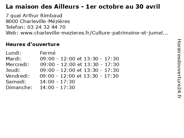 1 Musée Rimbaud - 1er Mai au 30 septembre (Distance: nan km) - Quai Arthur Rimbaud, 08000 Charleville-Mézières 1er, 30, au, mai, musée, muséographie originale et moderne, rimbaud, salles rêveries et révolutions, septembre 2 Musée Rimbaud - 1er octobre au 30 avril (Distance: nan km) - Quai Arthur Rimbaud, 08000 Charleville-Mézières 1er, 30, au, avril, musée, muséographie originale et moderne, octobre, rimbaud, salles rêveries et révolutions 3 La maison des Ailleurs - 1er Mai au 30 septembre (Distance: nan km) 7 quai Arthur Rimbaud, 08000 Charleville-Mézières 1er, 30, ailleurs, au, des, la, le parcours du poète, mai, maison, projections de films et de textes, septembre 4 Musée de l'Ardenne - 1er Mai au 30 septembre (Distance: 0,21 km) 31 place Ducale, 08000 Charleville-Mézières 1er, 30, arts de la marionnette, au, collections permanentes, de, l'ardenne, mai, musée, septembre 5 Musée de l'Ardenne - 1er octobre au 30 avril (Distance: 0,21 km) 31 place Ducale, 08000 Charleville-Mézières 1er, 30, arts de la marionnette, au, avril, collections permanentes, de, l'ardenne, musée, octobre 6 Un Jour Ailleurs (Distance: 0,34 km) 24 Rue de la République, 08000 Charleville-Mézières accessoires, ailleurs, jour, mode, un, vetements |