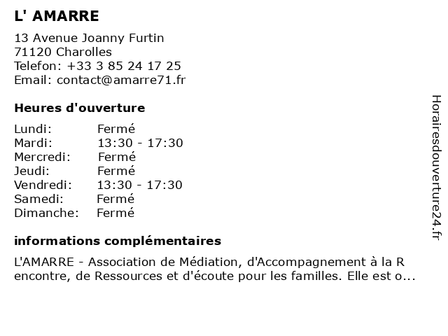L'AMARRE - Association de Médiation, d'Accompagnement à la Rencontre, de Ressources et d'écoute pour les familles. Elle est ouverte à toustes. L'association regroupe des services de Médiation ...