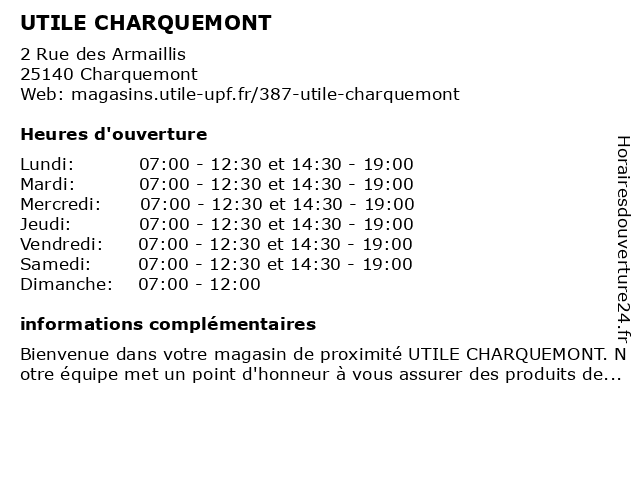 Bienvenue dans votre magasin de proximité UTILE CHARQUEMONT. Notre équipe met un point d'honneur à vous assurer des produits de qualité avec un service de proximité. Vous retrouverez dans nos ...