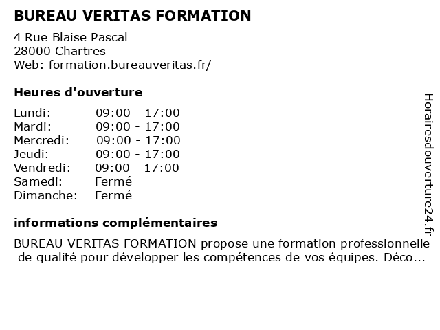 1 BUREAU VERITAS FORMATION (Distance: 5,39 km) 1 Rue Camille Claudel, 28630 Le Coudray bureau, formation, veritas 2 BUREAU VERITAS EXPLOITATION (Distance: 0,00 km) 4 Rue Blaise Pascal, 28000 Chartres bureau, exploitation, veritas 3 Bureau Veritas Construction (Distance: 0,24 km) Rue Denis Poisson, 28000 Chartres bureau, construction, veritas 4 B2Ei - Bureau d'Etudes (Distance: 1,61 km) 3 Rue Réaumur, 28000 Chartres armoires, b2ei, bureau, coffrets, câblage, d'etudes, électricité 5 AFEC - Centre de formation (Distance: 2,05 km) 10 Rue Dieudonné Costes, 28000 Chartres afec, alternance, centre, de, formation, groupe 6 Inter Formation Sécurité (Distance: 2,21 km) 1 Impasse du Bois Paris, 28630 Nogent-le-Phaye formation, inter, sécurité |