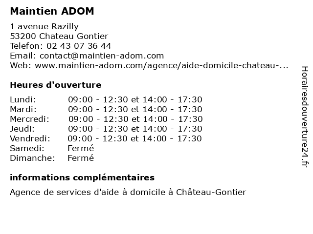 1 Maintien ADOM (Distance: 17,99 km) 33 Ter Route de Laval, 53170 Meslay du Maine adom, agence, aide, domicile, maintien, santé, seniors 2 Maintien ADOM (Distance: 18,64 km) 25 Rue de la Libération, 53400 Craon adom, aide, domicile, jardinage, maintien, ménage, nettoyage, repassage 3 Nounou ADOM (Distance: 0,08 km) 23 rue Pierre Martinet, 53200 Château-Gontier-sur-Mayenne adom, agence, domicile, garde, nounou, services 4 Avenue des Fleurs (Distance: 0,00 km) 9 Avenue Razilly, 53200 Château-Gontier avenue, des, détail, fleurs, jardinage, lina, magasins, pépinières, vente 5 O2 Home Services (Distance: 0,19 km) 52 avenue Carnot, 53200 Château-Gontier-sur-Mayenne aide aux seniors, garde d'enfants, handicap, home, incapacite temporaire, jardinage, menage repassage, o2, services 6 Maintien ADOM (Distance: 31,02 km) 6 Impasse des Tailleurs, 53810 Change adom, aide, domicile, jardinage, maintien, ménage, nettoyage, repassage |