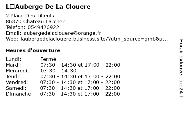 | Mardi | 07:30-14:30 et 17:00-22:00 |