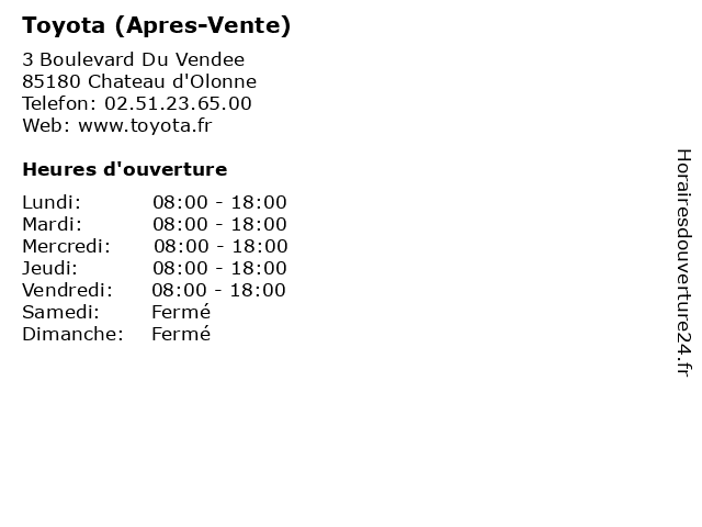 1 Toyota (Apres-Vente) (Distance: 0,66 km) 3 Rue Amedee, 85180 Chateau D'Olonne apres, automobiles, concéssionnaire, garage, motos, toyota, vente 2 Toyota (Apres-Vente) (Distance: 0,66 km) 3 Rue Amedee, 85180 Chateau D'Olonne apres, automobiles, concéssionnaire, garage, motos, toyota, vente 3 Toyota (Distance: 0,00 km) 3 Boulevard Du Vendee, 85180 Chateau d'Olonne automobiles, concessionnaire, garage, motos, toyota 4 Peugeot Clara automobiles (Après vente) (Distance: 1,27 km) s/n avenue du Marechal Juin, 85180 Le Château d'Olonne après, automobiles, clara, peugeot, pièces de rechange, vente, véhicules 5 Citroën Guenant Automobiles Sa (Après vente) (Distance: 37,09 km) 76 Rue de la Croisée, 85000 La Roche sur Yon apres, après, automobiles, citroën, guenant, sa, services, vente, véhicules 6 Toyota (Apres-Vente) (Distance: 42,16 km) . Boulevard Clémenceau, 85300 Challans apres, automobiles, concessionnaire, garage, motos, toyota, vente |