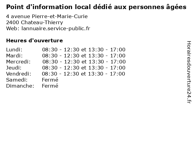 | Lundi | 08:30-12:30 et 13:30-17:00 |