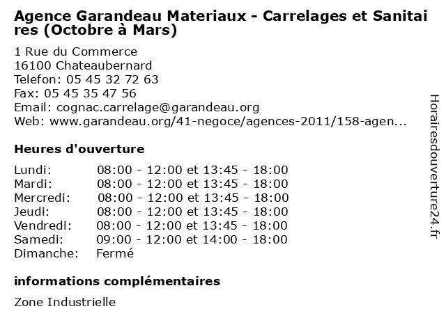 1 Agence Garandeau Materiaux (Octobre à Mars) (Distance: 0,00 km) 1 Rue du Commerce, 16100 Chateaubernard 31, agence, au, de dallages, du1er, garandeau, mars, materiaux, menuiserie extérieure, octobre, vente de carrelages, vente de matériaux de construction 2 Agence Garandeau Carrelages et Sanitaires (1er octobre - 31 mars) (Distance: 0,00 km) - Rue du Commerce, 16100 Chateaubernard 1er, 31, agence, carrelages, construction, et, garandeau, mars, materiaux, octobre, sanitaires 3 Charentaise de Motoculture - Mars à Octobre (Distance: 4,03 km) 5 rue des Platanes, 16100 Cognac agricole, charentaise, concessionnaire, de, entretien, mars, matériel, motoculture, octobre, pieces, réparation, services, tracteur, équipement 4 Office de Tourisme - Octobre à Mars (Distance: 10,47 km) 1 rue Pierre Viala, 16130 Segonzac brochures, cognac tourisme, de, guide saveurs, l’office, mars, octobre, office, renseignements, tourisme 5 Office de Tourisme - Octobre à Mars (Distance: 11,31 km) 7 quai de l’Orangerie, 16200 Jarnac brochures, cognac tourisme, de, guide saveurs, l’office, mars, octobre, office, renseignements, tourisme 6 Déchetterie (du 16 mars au 30 septembre) (Distance: 12,69 km) - Burie, 17770 Burie 16, 30, au, du, déchets, déchetterie, mars, septembre |