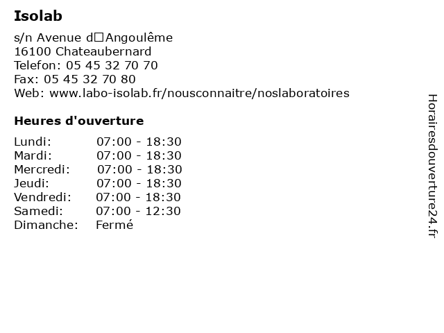 2 Laboratoire Isolab (Distance: 9,88 km) 5 place Jean Jaures, 16200 Jarnac isolab, laboratoire, services 3 Laboratoire Isolab (Distance: 24,56 km) 98 Avenue Jourdan, 17100 Saintes isolab, laboratoire, services 4 Laboratoire Isolab (Distance: 34,00 km) 53 rue Elysée Loustalot, 17400 Saint Jean d’Angély isolab, laboratoire, services 5 6 Laboratoire Isolab (Distance: 56,75 km) 41 boulevard de la République, 17200 Royan isolab, laboratoire, services |