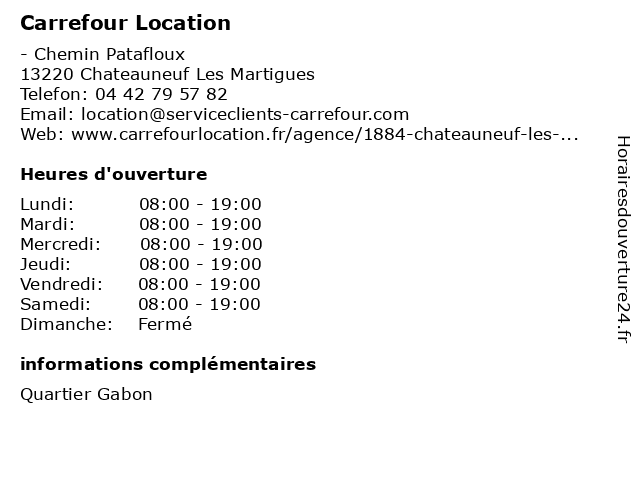 1 Carrefour Location (Distance: 1,96 km) - Route Nationale 568, 13220 Chateauneuf Les Martigues automobiles, carrefour, déménagements, location, véhicules 2 Carrefour Location (Distance: 10,38 km) - Route Nationale 113, 13127 Vitrolles agence, carrefour, location, utilitaires, véhicules 3 Carrefour Location (Distance: 14,42 km) . route départementale 9, 13290 Aix-en-Provence carrefour, location, trajet, utilitaire, véhicule 4 Carrefour Location (Distance: 14,51 km) - Quartier du Plan, 13340 Rognac automobiles, carrefour, déménagements, location, market, véhicules 5 Carrefour Location (Distance: 15,30 km) - Route Nationale 568, 13110 Port de Bouc automobiles, carrefour, déménagements, location, véhicules 6 Carrefour Station Service (Distance: 0,06 km) - Zone du Fourneiller, 13220 Châteauneuf-les-Martigues carburant, carrefour, essences, gazole, service, services, station |