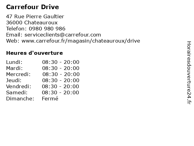 1 Carrefour Drive (Distance: 2,16 km) 40 Avenue D'argenton, 36000 Châteauroux alimentaire, carrefour, courses, drive, en ligne, magasin 2 Carrefour Drive (Distance: 4,36 km) . zac du Grand Déols, 36130 Déols carrefour, drive, hypermarche, marche, market 3 Carrefour Location (Distance: 0,00 km) 47 Rue Pierre Gaultier, 36000 Châteauroux agence, carrefour, location, utilitaires, véhicules 4 Carrefour Banque (Distance: 0,00 km) 47 Rue Pierre Gaultier, 36000 Châteauroux banque, carrefour, crédit, financement, épargne 5 Carrefour Fleurs (Distance: 0,00 km) . Rue Pierre Gaultier, 36032 Chateauroux beaute, cafe, carrefour, charline, chaussures, enfants, fleurs, hommes, lingerie, mode femmes, restaurant, sport 6 Carrefour Spectacles (Distance: 0,00 km) . Rue Pierre Gaultier, 36032 Chateauroux beaute, cafe, carrefour, charline, chaussures, enfants, hommes, lingerie, mode femmes, restaurant, spectacles, sport |