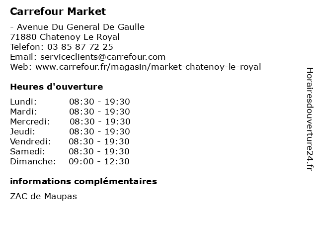 1 Carrefour Market (Distance: 6,54 km) - Rue du Curtil Canot, 71380 Saint-Marcel carrefour, hard discount, hypermarchés, les dépanneurs, market, supermarchés 2 Carrefour Market (Distance: 14,78 km) - Grillot Prejeannot, 21190 Corpeau alimentation, carrefour, magasin discount, market, supermarché 3 Carrefour Station Service (Distance: 0,57 km) . Avenue Du General De Gaulle, 71880 Chatenoy Le Royal automobiles, carrefour, oil, service, services, station, stations essences 4 Carrefour Location (Distance: 0,57 km) - Avenue Du General De Gaulle, 71880 Chatenoy-le-Royal agence, carrefour, location, utilitaires, véhicules 5 Carrefour Drive (Distance: 0,57 km) - Avenue Du General De Gaulle, 71880 Châtenoy-le-Royal alimentaire, carrefour, courses, drive, en ligne, magasin 6 Carrefour Location (Distance: 2,56 km) 144 Avenue de Paris, 71100 Chalon sur Saône carrefour, de, e.leclerc, location, service, services, services a la personne, véhicules |