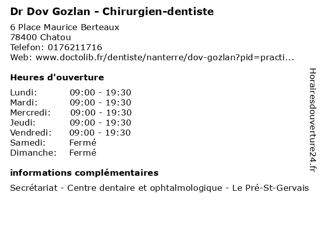 1 Dr Dov Gozlan - Chirurgien-dentiste (Distance: 0,12 km) 6 Place Maurice Berteaux, 78400 Chatou chirurgien, consultation, dentiste, docteur, dov, dr, gozlan, med, médecin, médecine, secrétariat, traitement 2 Dr. Yves Gozlan - Dentiste (Distance: 5,40 km) 643 Terrasses Arche, 92000 Nanterre dentiste, docteur, dr., gozlan, medecins, sante, yves 3 Dr Hanna Gozlan - Chirurgien-dentiste (Distance: 5,55 km) 13 Avenue de la République, 78500 Sartrouville chirurgien, dentaire, dentiste, dr, gozlan, hanna, implantologie, parodontologie 4 Maître Dov Milsztajn - Avocat (Distance: 8,33 km) 2 Rue Ancelle, 92200 Neuilly-sur-Seine avocat, avocate, avocats, civils, dov, droits, juridiques, maître, milsztajn 5 Maître Gary Gozlan - Avocat (Distance: 9,31 km) 2 Rue Sainte-Geneviève, 92400 Courbevoie avocat, avocate, avocats, civils, droits, gary, gozlan, juridiques, maître 6 Danielle Gozlan - Psychologue (Distance: 9,44 km) 65 Rue Chardon Lagache, 75016 Paris danielle, folie, gozlan, psychiatre, psychiatrie, psychiatrique, psychologue |