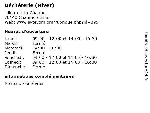 1 Déchèterie (Hiver) (Distance: 8,94 km) - rue principale, 39350 Saligney déchèterie, gravats, hiver, huiles usées, la réception des déchets et écocentres, les appareils électroménagers, les déchets verts, papier et carton en quantité 2 Déchèterie (Hiver) (Distance: 10,91 km) - ZI les Plantes, 70150 Marnay bennes, débarras, déchèterie, détritus, hiver, ordures, poubelles 3 Déchèterie (Hiver) (Distance: 16,24 km) - route départementale 67, 25170 Placey bennes, débarras, déchèterie, détritus, hiver, ordures, poubelles 4 Déchèterie (Hiver) (Distance: 17,47 km) - lieu-dit Bois des Giranaux, 70100 Arc-lès-Gray bennes, débarras, déchèterie, détritus, hiver, ordures, poubelles 5 Déchèterie (hiver) (Distance: 18,13 km) 6, chemin du Tissage, 39700 Dampierre déchèterie, gravats, hiver, huiles usées, la réception des déchets et écocentres, les appareils électroménagers, les déchets verts, papier et carton en quantité 6 Déchèterie (Hiver) (Distance: 19,18 km) - lieu-dit des Graverots, 70700 Gy bennes, débarras, déchèterie, détritus, hiver, ordures, poubelles |