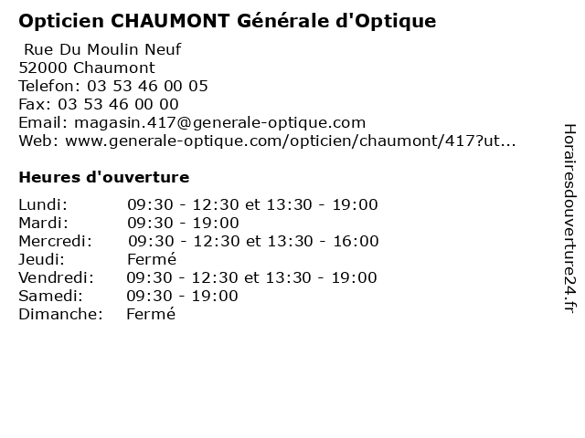 1 E.Leclerc Optique (Distance: 0,52 km) . Faubourg du Moulin Neuf, 52000 Chaumont e.leclerc, optique, service, services, services à la personne 2 3 La Mutuelle Générale (Distance: 1,09 km) 72 Rue Victoire de la Marne, 52903 Chaumont agence, assurance, complémentaire, générale, la, mutuelle, santé 4 Opticien Chaumont - Optic 2000 (Distance: 1,15 km) 1 Rue du Docteur Michel, 52000 Chaumont 2000, chaumont, lentilles de contact, lunettes de soleil, lunettes de vue, optic, optic2000, opticien, opticien optic2000, ray-ban, rayban 5 Opticien Chaumont | Alain Afflelou (Distance: 1,19 km) 56 Rue Victoire De La Marne, 52000 Chaumont afflelou, alain, cabinet d'ophtalmologie, chaumont, magasin de lunettes de soleil, ophtalmologie, opticien, optométrie 6 Cabinet médical Tréfousse - Médecine générale (secrétariat ) (Distance: 1,37 km) 19 place des droits de l'Homme, 52000 Chaumont cabinet, consultation, docteur, générale, médecine, médical, santé, secrétariat, tréfousse |