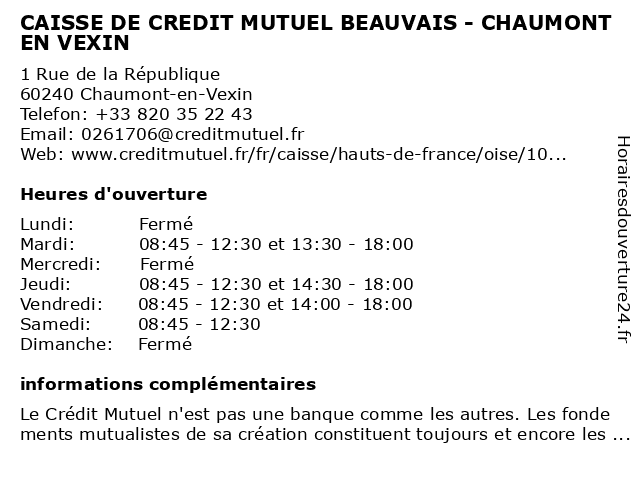 Termes de recherche pour CAISSE DE CREDIT MUTUEL BEAUVAIS - CHAUMONT EN VEXIN:en, de, beauvais, chaumont, crédit, mutuel, caisse, vexin |