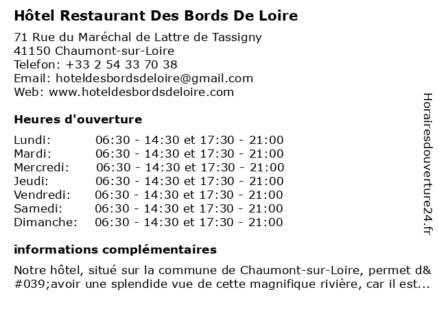 1 Café Hôtel Restaurant De La Gare SARL (Distance: 1,28 km) 19 Avenue de la République, 41150 Veuzain-sur-Loire café, de, gare, hôtel, la, restaurant, sarl 2 Hôtel-Restaurant Les Hauts de Loire (Distance: 4,05 km) 79 rue Gilbert Navard, 41150 Onzain bar, de, hauts, hotel, hôtel, les, loire, restaurant, réunions, évenements 4 Hôtel 17.4 Lycée (Distance: 13,72 km) 174 Rue Albert 1er, 41000 Blois 17.4, bar, hotel, hôtel, lycée, restaurant, service 5 Hôtel Bellevue (Distance: 15,36 km) 24 Quai de la République, 41400 Montrichard Val de Cher bellevue, hôtel 6 Hôtel Le Bellevue (Distance: 15,36 km) 24 Quai de la République, 41400 Montrichard Val de Cher bellevue, hôtel, le, restaurant, tourisme |