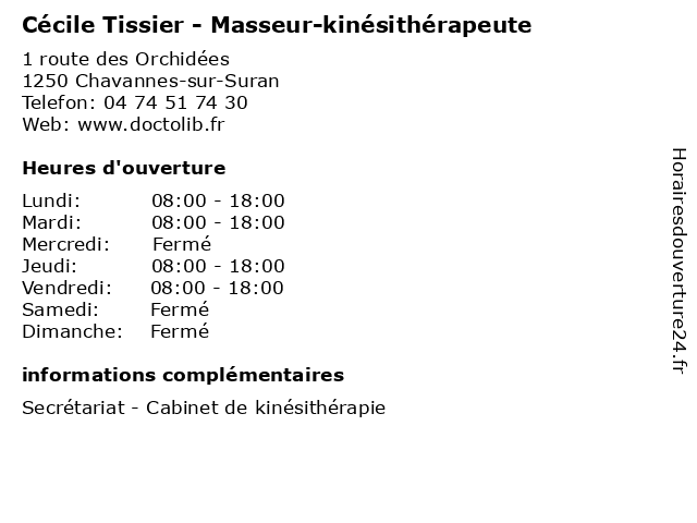 1 Benjamin Tissier - Masseur-kinésithérapeute (Distance: 0,00 km) 1 route des Orchidées, 01250 Chavannes-sur-Suran benjamin, docteur, dr, kinésithérapeute, masseur, médecin, rééducation, secrétariat, soin, tissier 2 Benjamin Tissier - Masseur-kinésithérapeute (Distance: 8,33 km) 80 route de Bourg, 01250 Villereversure benjamin, docteur, dr, kinésithérapeute, massage, masseur, médecin, rééducation, secrétariat, soin, tissier 3 Dr Cécile Pillet - Psychiatre (Distance: 16,21 km) - Avenue de Marboz, 01000 Bourg-en-Bresse cecile, consultation, cécile, docteur, dr, med, medecine, medical, médecin, pillet, psychiatre, traitement 4 Cécile Bouillot - Sage-femme (Distance: 17,18 km) 900 Route De Paris, 01000 Bourg En Bresse bouillot, cecile, consultation, cécile, docteur, femme, med, medecine, medical, médecin, sage, traitement 5 Cécile Chassin - Sage-femme (Distance: 17,21 km) 900 Route De Paris, 01000 Bourg En Bresse cecile, chassin, consultation, cécile, docteur, femme, med, medecine, medical, médecin, sage, traitement 6 Cécile Galliano - Masseur kinésithérapeute (Distance: 19,31 km) 261 rue de Schutterwald, 01000 Saint-Denis-lès-Bourg consultation, cécile, docteur, galliano, kinésithérapeute, masseur, med, médecin, traitement |