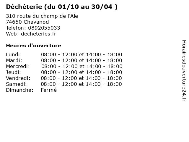 1 Déchèterie (du 01/10 au 30/04 ) (Distance: 5,25 km) - Rue des Terrasses, 74960 Cran-Gevrier 01/10, 30/04, au, du, déchèterie, gravats, huiles usées, la réception des déchets et écocentres, les appareils électroménagers, les déchets verts, papier et carton en quantité 2 Déchèterie (du 01/10 au 30/04 ) (Distance: 7,98 km) - Chemin de Saint-Paul, 74330 Épagny 01/10, 30/04, au, du, déchèterie, gravats, huiles usées, la réception des déchets et écocentres, les appareils électroménagers, les déchets verts, papier et carton en quantité 3 Déchèterie (du 01/05 au 30/09 ) (Distance: 0,00 km) 310 route du champ de l'Ale, 74650 Chavanod 01/05, 30/09, au, du, déchèterie, gravats, huiles usées, la réception des déchets et écocentres, les appareils électroménagers, les déchets verts, papier et carton en quantité 4 Déchèterie (du 01/05 au 30/09 ) (Distance: 4,73 km) - Chemin Flaquet, 74000 Annecy 01/05, 30/09, au, du, déchèterie, gravats, huiles usées, la réception des déchets et écocentres, les appareils électroménagers, les déchets verts, papier et carton en quantité 5 Musée-Château (du 01/06 au 30/09) (Distance: 5,21 km) - Place du Château, 74000 Annecy 01/06, 30/09, ancien, art, au, château, du, exposition, histoire, livre, monument, musique, musée, philharmonie, savoir 6 Déchèterie (du 01/05 au 30/09 ) (Distance: 5,25 km) - Rue des Terrasses, 74960 Cran-Gevrier 01/05, 30/09, au, du, déchèterie, gravats, huiles usées, la réception des déchets et écocentres, les appareils électroménagers, les déchets verts, papier et carton en quantité |