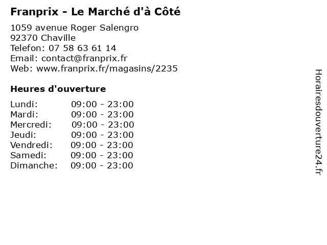 1 Franprix - Le Marché d'à Côté (Distance: 7,32 km) 4 Rue Salomon de Rothschild, 92150 Suresnes alimentation, côté, d'à, epicerie, franprix, le, marché, supermarché 2 Franprix - Le Marché d'à Côté (Distance: 9,18 km) 372 Avenue de la Division Leclerc, 92290 Châtenay-Malabry alimentation, côté, d'à, epicerie, franprix, le, marché, supermarché 3 Franprix - Le Marché d'à Côté (Distance: 10,31 km) 12 Rue de Versailles, 91300 Massy alimentation, côté, d'à, epicerie, franprix, le, marché, supermarché 4 Franprix - Le Marché d'à Côté (Distance: 17,86 km) 7 rue Gabriel Péri, 93200 Saint-Denis alimentation, côté, d'à, epicerie, franprix, le, marché, supermarché 5 Franprix (Distance: 0,20 km) 855 Avenue Roger Salengro, 92370 Chaville bibi, carte de fidélité, courses, franprix, magasin, produits frais, programme de fidélité, supermarché, épicerie 6 Marché à Rémilly (Distance: 4,12 km) . Ville, 57580 Rémilly frutas, hortalizas, marché, mercado, rémilly, verduras |