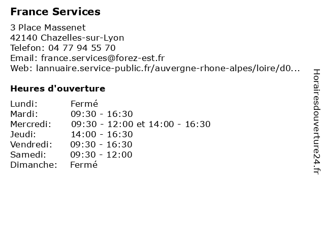 1 France Services (Distance: 4,84 km) 57 rue des Tanneries, 69590 Saint-Symphorien-sur-Coise administration, au, coise, de, france, maison, organismes, public, publics, saint, services, sur, symphorien 2 France Services (Distance: 12,46 km) 2 Rue Michel Laval, 42340 Veauche administration, communes, france, service, services, services publics 3 France Services (Distance: 12,58 km) 122 avenue des Quatre Cantons, 69930 Saint-Laurent-de-Chamousset administration, au, chamousset, de, france, laurent, maison, organismes, public, publics, saint, services 4 Caisse D'Allocations Familiales (Distance: 0,01 km) 3 Place Massenet, 42140 Chazelles-sur-Lyon administration, assoc, caisse, d'allocations, familiales, services, services publics 5 Caisse Primaire D'Assurance Maladie (Distance: 0,01 km) 3 Place Massenet, 42140 Chazelles-sur-Lyon administration, assoc, caisse, d'assurance, maladie, primaire, services, services publics 6 France Romanetti-Gonnard - Psychologue - secrétariat (Distance: 0,06 km) 8 Rue Jean Jaurès, 42140 Chazelles-sur-Lyon cabinets, france, gonnard, médecins, psychologue, romanetti, secrétariat, thérapies |