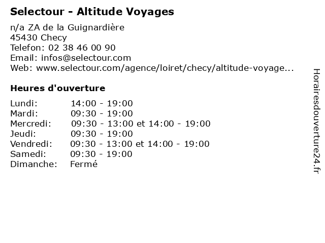 1 Selectour - Altitude Voyages (Distance: 10,84 km) 4 place du Général de Gaulle, 45000 Orléans agence, altitude, circuits, selectour, séjours, vol, voyages 3 Havas Voyages (Distance: 10,65 km) 293 Rue de Bourgogne, 45000 Orleans agence, havas, services, voyages 6 Look Voyages (Distance: 10,83 km) 10 Place de Gaulle, 45000 Orleans agence, billet d'avion et hôtel pour votre club, look, séjour, voyage, voyages |