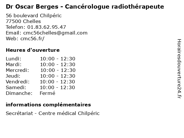 1 Dr Thierry Toubiana - Cancérologue radiothérapeute (Distance: 0,00 km) 56 boulevard Chilpéric, 77500 Chelles cancérologue, consultation, docteur, dr, med, médecin, médecine, radiothérapeute, thierry, toubiana, traitement 2 Oscar Di Martino - Masseur-kinésithérapeute (Distance: 7,74 km) 71 Avenue Salvador Allende, 94500 Champigny-sur-Marne di, kiné, kinésithérapeute, martino, masseur, oscar, rééducation, soin 3 Bibliothèque Oscar Wilde (Distance: 13,44 km) 12 rue du Télégraphe, 75020 Paris bibliothèque, joyeuse, l'heure, livre, médiathèque, oscar, services, wilde 4 Oscar B Studio (Distance: 14,68 km) 16 Quai Jean Baptiste Clément, 94140 Alfortville 3d, animation, films, oscar, studio 5 Oscar Palace (Distance: 16,43 km) 19 Chemin d 'Aubervilliers, 93200 Saint-Denis cuisine, oscar, palace, restaurants, restauration 6 Dr Natacha Bourry - Cancérologue radiothérapeute (Distance: 17,06 km) - Lieu-dit Forcilles, 77150 Férolles-Attilly bourry, cancérologue, consultation, docteur, dr, med, médecin, médecine, natacha, radiothérapeute, traitement |
