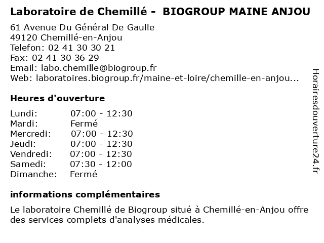 Termes de recherche pour Laboratoire de Chemillé - BIOGROUP MAINE ANJOU:de, laboratoire, anjou, maine, chemillé, biogroup, dépistages, laboratoire de diagnostic |