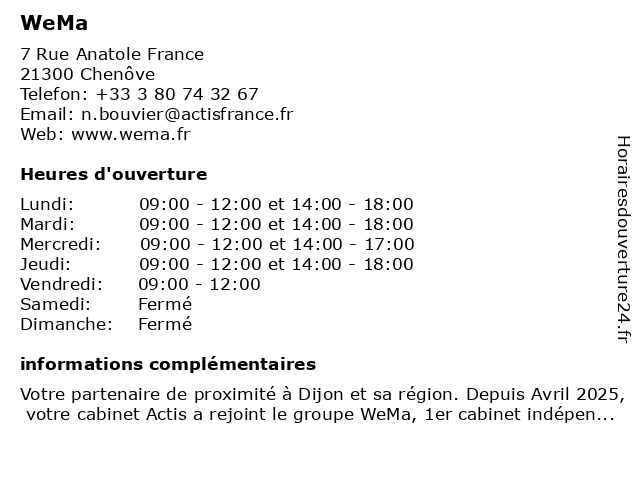 1 WeMa (Distance: 0,00 km)7 Rue Anatole France, 21300 Chenôve wema