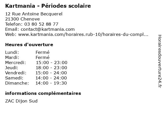 1 Kartmania - Vacances Scolaires - Hors Eté (Distance: 0,40 km) 12 Rue Antoine Becquerel, 21300 Chenove eté, hors, karting, kartmania, karts, loisirs, motos, piste, quads, scolaire, scolaires, vacances, été 2 Kartmania Dijon Complexe de Karting (Distance: 0,41 km) 12 Rue Antoine Becquerel, 21300 Chenôve complexe, de, dijon, karting, kartmania 3 Centre Nautique Municipal - public en période scolaire (Le Sauna) (Distance: 1,79 km) 30 bis rue Ernest Renan, 21300 Chenôve aqua, aquatique, centre, en, le, municipal, nautique, piscine, public, période, sauna, scolaire 4 Centre Nautique Municipal - public en période scolaire (3ème bassin) (Distance: 1,79 km) 30 bis rue Ernest Renan, 21300 Chenôve 3ème, aqua, aquatique, bassin, centre, en, municipal, nautique, piscine, public, période, scolaire 5 Centre Nautique Municipal - public en période scolaire (La Piscine) (Distance: 1,79 km) 30 bis rue Ernest Renan, 21300 Chenôve aqua, aquatique, centre, en, la, municipal, nautique, piscine, public, période, scolaire 6 PEP CBFC - Accueil de loisirs extra scolaire Colombiere/Tempo (Distance: 2,53 km) 8 avenue Greuze, 21000 Dijon accompagnement, accueil, aides, cbfc, colombiere/tempo, de, extra, loisirs, pep, scolaire, social, socio-éducatif, équipe, établissements |