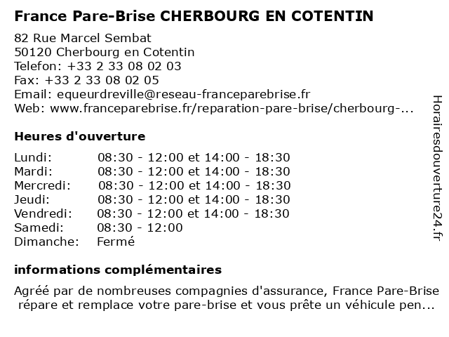 1 France Pare Brise (Distance: 0,68 km) 82 Rue Marcel Sembat, 50120 Équeurdreville-Hainneville bris de glace, brise, france, pare, services 2 Mondial Pare-Brise (Distance: 7,16 km) 665 Boulevard de l'Est, 50110 Cherbourg-en-Cotentin brise, mondial, pare 3 France Pare-Brise (Distance: 7,81 km) 630, rue Jean Bouin -, 50110 Tourlaville bris de glace, brise, france, pare, réparation et remplacement, services 4 123 Pare-Brise Cherbourg (Distance: 8,66 km) Rond-Point des Marettes, 50470 Cherbourg-en-Cotentin 123, 123 pare-brise, bris de glace, brise, calibrage caméra adas, carte cadeau, changement pare-brise, cherbourg, franchise offerte, lunette arrière, pare, pare-brise, remplacement pare-brise, réparation pare-brise, toit panoramique, vitre latérale 5 Mondial Pare-Brise - Point Relais (Distance: 10,59 km) 25 Rue du Millecent, 50440 La hague brise, mondial, pare, point, relais 6 Mondial Pare-Brise - Point Relais (Distance: 10,79 km) 7 Rue du Vieux Chemin, 50440 La Hague brise, mondial, pare, point, relais |