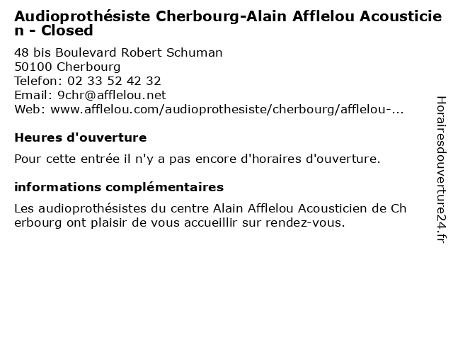 Termes de recherche pour Audioprothésiste Cherbourg-Alain Afflelou Acousticien - Closed:alain, afflelou, cherbourg, acousticien, audioprothésiste, closed, audiologie, clinique médicale |