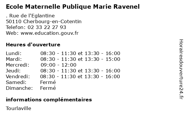 1 Ecole Elementaire Publique Marie Ravenel (Distance: 0,00 km) . Rue de l'Eglantine, 50110 Cherbourg-en-Cotentin cours, ecole, education, elementaire, marie, publique, ravenel, services, école, élémentaire 2 École Primaire Publique (Distance: 12,11 km) - Couville, 14370 Moult ecole, education, maternelle, primaire, publique, services, école 3 École Primaire Publique (Distance: 14,08 km) - Lebourg, 50440 Acqueville ecole, education, maternelle, primaire, publique, services, école 4 École Primaire Publique (Distance: 46,81 km) - Place de la République, 14450 Grandcamp-Maisy ecole, education, maternelle, primaire, publique, services, école 5 École Maternelle Publique (Distance: 48,51 km) 2 Rue des écoles, 14230 Isigny-sur-Mer ecole, education, maternelle, publique, services, école 6 École Primaire Publique (Distance: 49,06 km) - Lebourg, 14230 Osmanville ecole, education, maternelle, primaire, publique, services, école |