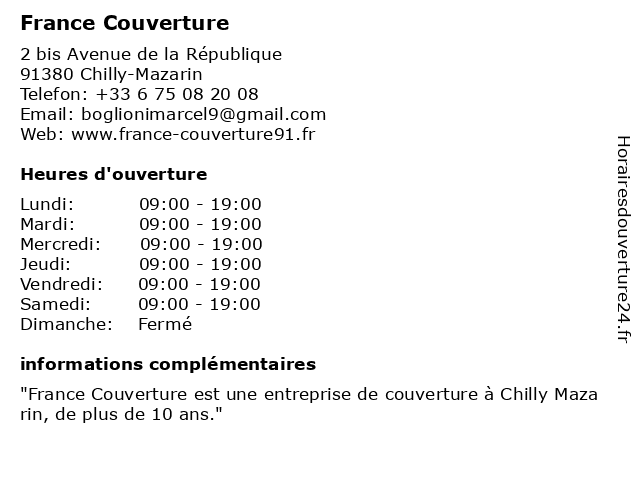 1 France Couverture (Distance: 0,86 km) 2 bis Avenue République, 91380 Chilly mazarin couverture, france 2 France Couverture (Distance: 4,93 km) 19 Rue Maurice Pillet, 91160 Saulx-les-Chartreux couverture, france 3 GIF Couverture (Distance: 0,01 km) 4 bis Avenue de la République, 91380 Chilly mazarin couverture, gif 4 C.C.M Charpente Couverture Maçonnerie (Distance: 0,59 km) 1 Rue des Marguerites, 91380 Chilly-Mazarin c.c.m, charpente, couverture, maçonnerie 5 Acces Couverture SAS (Distance: 0,96 km) 32 Rue Pierre Mendès France, 91380 Chilly-Mazarin acces, couverture, sas 6 |