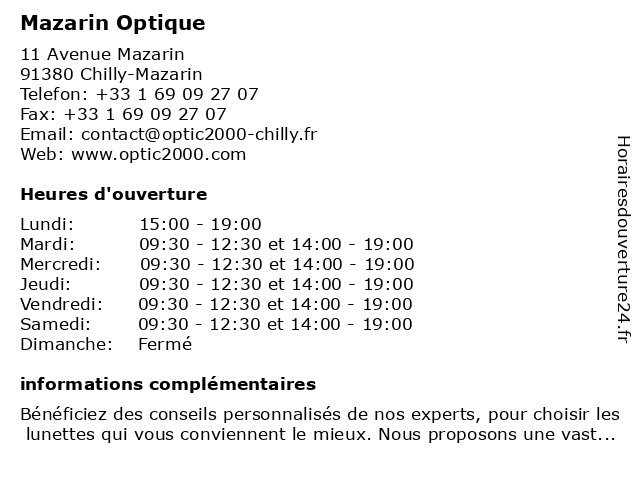 1 La Boutique d'Optique (Distance: 1,91 km) 56 rue du Président François Mitterrand, 91160 Longjumeau boutique, d'optique, la, lunettes, monture, opticien, optique, solaire, vue 2 Generale d'Optique (Distance: 3,73 km) n/a Avenue de l'Europe, 91300 Massy care, clinic, d'optique, doctor, generale, health, optic, opticiens, optique, vision 3 Generale d'Optique (Distance: 4,81 km) n/a Chemin de Briis, 91180 Villebon sur Yvette care, clinic, d'optique, doctor, generale, health, optic, opticiens, optique, vision 4 Generale Optique (Distance: 5,07 km) . Ville de Bois, 91620 La Ville du Bois beaute, cafe, chaussures, enfants, generale, hommes, lingerie, mode femmes, optique, restaurant, sport 5 Mod'Optique (Distance: 5,37 km) 62 Rue de Paris, 91120 Palaiseau accessoires, lentilles, lunettes, mod'optique, opticien, optique 6 Opticien Générale d'Optique FRESNES (Distance: 5,71 km) 22 Avenue Edouard Herriot, 94260 Fresnes d'optique, fresnes, générale, opticien |