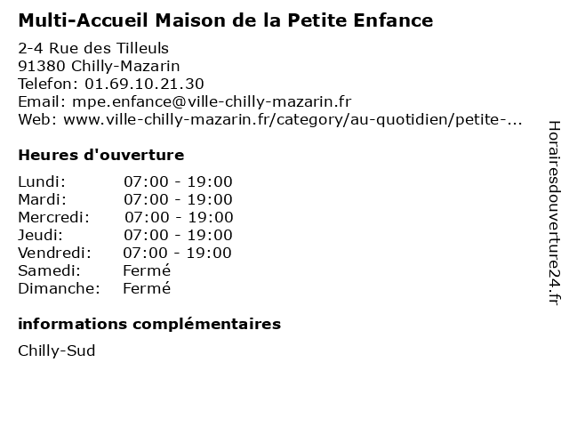 1 Multi-Accueil Mazarin (Distance: 1,23 km) 57 Avenue Mazarin, 91380 Chilly-Mazarin accueil, creche, enfant, eveil, garderie, mazarin, multi 2 Service d'accueil familial (Distance: 1,27 km) n/a Allée Lavoisier, 91420 Morangis caregivers houses, child care, d'accueil, familial, family home, home care, kindergartens, micro-nurseries, parental home, service 3 Centre d'information et D'Orientation (Accueil ouvert pendant) (Distance: 1,31 km) 5 Avenue de Carlet, 91380 Chilly-Mazarin accueil, administration, assoc, centre, d'information, d'orientation, et, ouvert, pendant, services, services publics 4 Multi Accueil (Distance: 3,87 km) 6 Avenue des gardes Messiers, 91360 Villemoisson Sur Orge accueil, caregivers houses, child care, family home, home care, kindergartens, micro-nurseries, multi, parental home 5 Multi Accueil S. Lacore - l'accueil régulier (Distance: 4,49 km) 2 Avenue de Bretagne, 91170 Viry Chatillon accueil, caregivers houses, child care, family home, home care, kindergartens, l'accueil, lacore, micro-nurseries, multi, parental home, régulier, s. 6 Multi Accueil S. Lacore - l'accueil occasionnel (Distance: 4,49 km) 2 Avenue de Bretagne, 91170 Viry Chatillon accueil, caregivers houses, child care, family home, home care, kindergartens, l'accueil, lacore, micro-nurseries, multi, occasionnel, parental home, s. |
