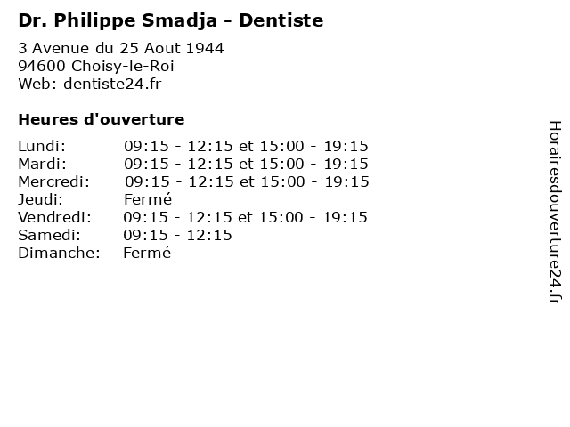 | Lundi | 09:15-12:15 et 15:00-19:15 |