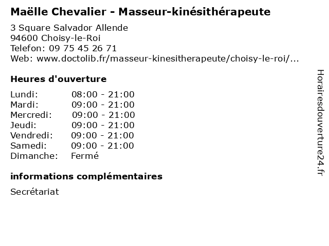 1 Maëlle Chevalier - Masseur-kinésithérapeute (Distance: 2,75 km) 40 Rue du Nouvelet, 94310 Orly chevalier, docteur, kine, kinesitherapeute, kinésithérapeute, masseur, maëlle 2 Maître Nathalie Chevalier - Avocate (Distance: 6,61 km) 5 Place des Marseillais, 94220 Charenton le Pont avocate, avocats, chevalier, civils, droits, juridiques, maître, nathalie 3 Maître Camille Chevalier - Avocate (Distance: 7,77 km) 2 Avenue de la Providence, 92160 Antony avocate, avocats, camille, chevalier, civils, droits, juridiques, maître 4 Maëlle Delin - Sage-femme (Distance: 8,75 km) 12-18 rue du Sergent Bauchat, 75012 Paris consultation, delin, docteur, femme, maëlle, med, médecin, médecine, sage, traitement 5 Institut Maëlle (Distance: 11,09 km) 176 Rue de Vaugirard, 75015 Paris beauté, institut, manucure, massage, maëlle, soins, épilation 6 Dr Maëlle Ghazali-Abouzidan - Chirurgien-dentiste (Distance: 12,51 km) 33 Rue Rouget de Lisle, 92130 Issy-les-Moulineaux abouzidan, chirurgien, consultation, dentiste, docteur, dr, ghazali, maëlle, med, médecin, traitement |