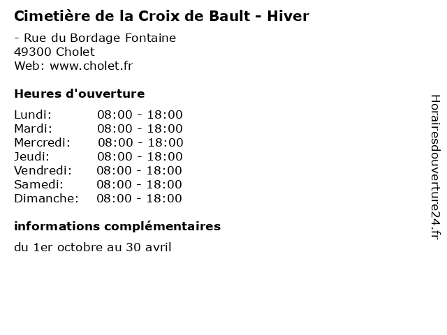1 Cimetière de la Croix de Bault - Eté (Distance: 0,00 km) - Rue du Bordage Fontaine, 49300 Cholet bault, cercueil, cimetiere, cimetière, croix, de, deuil, eté, la, mort 2 Croix-Rouge Française (Distance: 1,06 km) 22 Rue de la Hollande, 49300 Cholet bénévole, cholet, croix, croix-rouge, française, locale, rouge, secours, unité 3 Cimetière Saint Martin Du 10 juin au 25 août (Distance: 19,08 km) 77 Rue Saint-Martin, 49600 Beaupreau 10, 25, août, arbre, au, cimetiere, cimetière, du, espace vert, forêt, funeraire, jardin, juin, loisirs, martin, nature, parc, prairie, saint, square 4 Cimetière Saint Martin Du 4 novembre au 31 décembre (Distance: 19,08 km) 77 Rue Saint-Martin, 49600 Beaupreau 31, arbre, au, cimetiere, cimetière, du, décembre, espace vert, forêt, funeraire, jardin, loisirs, martin, nature, novembre, parc, prairie, saint, square 5 Cimetière Saint Martin Du 25 mars au 9 juin / Du 26 août au 3 novembre (Distance: 19,08 km) 77 Rue Saint-Martin, 49600 Beaupreau 25, 26, août, arbre, au, cimetiere, cimetière, du, espace vert, forêt, funeraire, jardin, juin, loisirs, mars, martin, nature, novembre, parc, saint 6 Cimetière Saint Martin Du 1er janvier au 24 mars (Distance: 19,11 km) 77 Rue Saint-Martin, 49600 Beaupreau 1er, 24, arbre, au, cimetiere, cimetière, du, espace vert, forêt, funeraire, janvier, jardin, loisirs, mars, martin, nature, parc, prairie, saint, square |