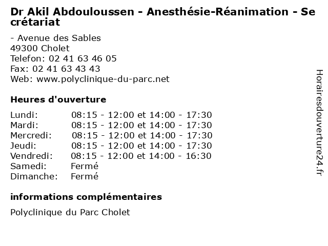 1 Dr Baptiste Tailhan - Anesthésie-Réanimation - Secrétariat (Distance: 0,00 km) - Avenue des Sables, 49300 Cholet anesthésie, baptiste, dr, médecin, médecine, médical, pharmaceutique, réanimation, secrétariat, tailhan, traitement 2 Dr Bertrand Dousset - Anesthésie-Réanimation - Secrétariat (Distance: 0,00 km) - Avenue des Sables, 49300 Cholet anesthésie, bertrand, dousset, dr, médecin, médecine, médical, pharmaceutique, réanimation, secrétariat, traitement 3 Dr Francoise Garrec - Anesthésie-Réanimation - Secrétariat (Distance: 0,00 km) - Avenue des Sables, 49300 Cholet anesthésie, dr, francoise, garrec, médecin, médecine, médical, pharmaceutique, réanimation, secrétariat, traitement 4 Dr Joachin Langlois - Anesthésie-Réanimation - Secrétariat (Distance: 0,00 km) - Avenue des Sables, 49300 Cholet anesthésie, dr, joachin, langlois, médecin, médecine, médical, pharmaceutique, réanimation, secrétariat, traitement 5 Dr Sebastian Duchene - Anesthésie-Réanimation - Secrétariat (Distance: 0,00 km) - Avenue des Sables, 49300 Cholet anesthésie, dr, duchene, médecin, médecine, médical, pharmaceutique, réanimation, sebastian, secrétariat, traitement 6 Dr Thierry Lechevalier - Anesthésie-Réanimation - Secrétariat (Distance: 0,00 km) - Avenue des Sables, 49300 Cholet anesthésie, dr, lechevalier, médecin, médecine, médical, pharmaceutique, réanimation, secrétariat, thierry, traitement |