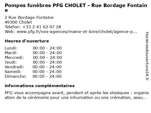 1 Pompes Funèbres Gillard Mathon (Distance: 0,06 km) 46 Rue du Docteur Charles Coubard, 49300 Cholet funèbres, gillard, mathon, pompes 2 Pompes Funèbres Cholet (Distance: 0,08 km) 143 Rue Porte Baron, 49300 Cholet cholet, funèbres, pierre tombale-plaque funéraire, pompes, pompes funèbres 3 Pompes funèbres PFG CHOLET - Boulevard Delhumeau Plessis (Distance: 0,97 km) 13 Boulevard Delhumeau Plessis, 49300 Cholet avis de décès, boulevard, cholet, crémation, delhumeau, entretien de sépulture, fleurs deuil, formalités après obsèques, funèbres, inhumation, marbrerie, monument funéraire, pfg, plessis, pompes, pompes funèbres, prévoyance obsèques 4 Rue De La Fête (Distance: 3,44 km) 7 Rue Sorel Tracy, 49300 Cholet accessoires, bijoux, chaussures, de, fête, homme, la, mode femme, restaurant, rue, services 5 Pension Canine du Bordage (Distance: 7,35 km) - Le Bordage Ruisseau, 49300 Cholet animal, bordage, canine, chien, chiens, du, pension, pension canine, pour 6 Pompes Funèbres Cholet-maulevraises (Distance: 9,23 km) Boulevard Jean Monnet, 49360 Maulevrier cholet, funèbres, maulevraises, pompes |