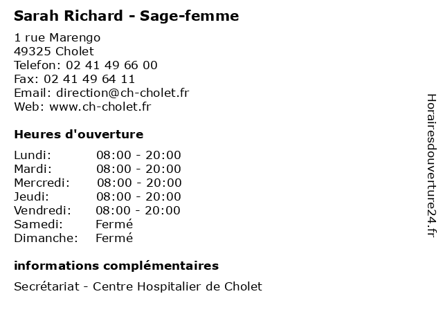 3 Emma Richard - Sage-femme (Distance: 6,41 km) 2 Rue du Manitoba, 49300 Cholet emma, femme, medical, richard, sage, sagefemme 5 Sarl Richard Grellier (Distance: 41,98 km) 48 Rue Nationale, 49170 St Georges Sur Loire grellier, restaurants, richard 6 Maître Bruno Richard - Avocat (Distance: 50,16 km) 91 route de Clisson, 44230 Saint-Sébastien-sur-Loire avocat, avocats, bruno, civils, droits, juridiques, maître, richard |