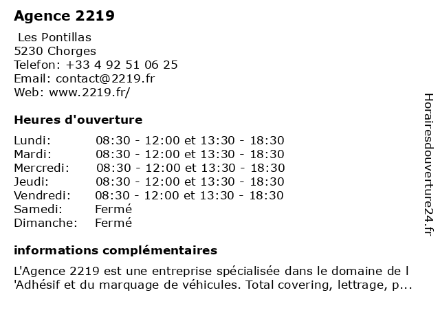 1 Agence 2219 (Distance: 51,35 km) - chemin Champarlau, 04200 Peipin 2219, agence, agence 2219, communication, marketing 2 Agence 2219 (Distance: 51,51 km) . Route de Champarlau, 04200 Peipin 2219, agence, entreprise, logo, marquage, projet, qualite, vehicule |