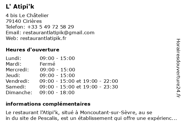 Le restaurant l'Atipi'k, situé à Moncoutant-sur-Sèvre, au sein du site de Pescalis, est un établissement qui offre une expérience culinaire unique, alliant convivialité et gastronomie. Le cad...