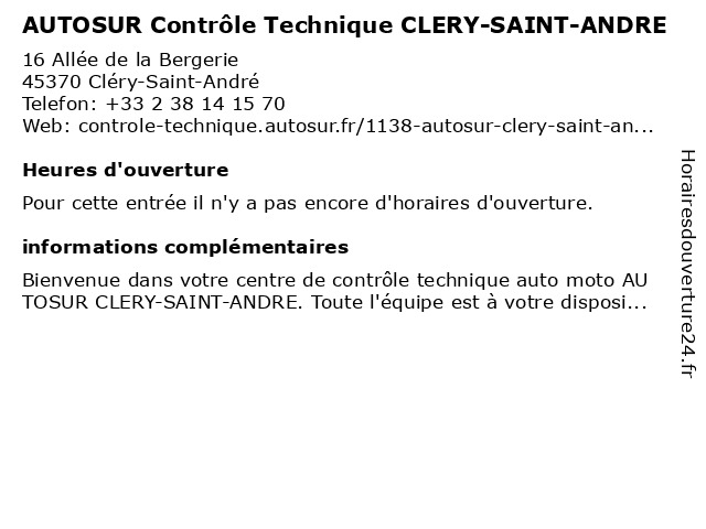 | Appeler AUTOSUR Contrôle Technique CLERY-SAINT-ANDRE | |