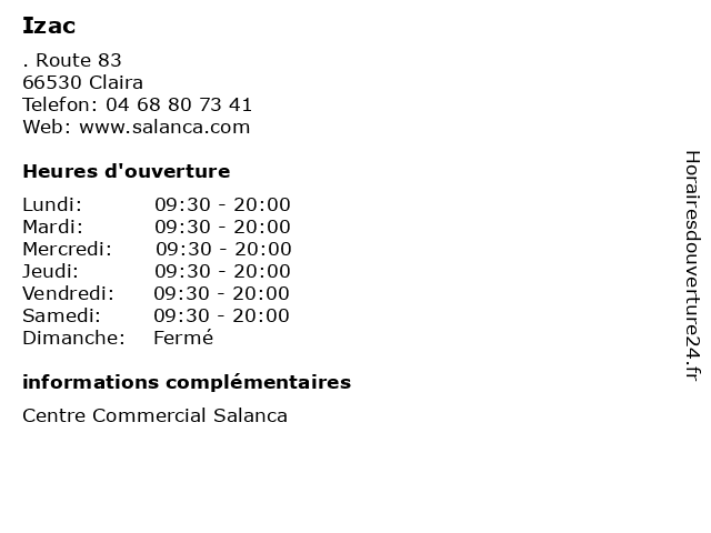 1 IZAC (Distance: 3,65 km) . De Barcares, 66531 Claire cafe, chaussures, enfants, homme, izac, mode femme, restaurant, sport 2 Izac (Distance: 3,98 km) . Route de Saint Jaume, 66530 Claira beaute, cafe, chaussures, enfants, hommes, izac, lingerie, mode femmes, restaurant, sport 3 Izac (Distance: 9,24 km) . Avenue d'Espagne, 66000 Perpignan aushopping, centre, commercial, espagne, izac, porte 4 IZAC (Distance: 11,58 km) . Lieu-dit Escale, 66000 Perpignan beaute, boutiques, brasserie, cache, chaussures, concorde, deco, enfants, izac, le, mode femme, mode hommes, restaurant, sport 5 Carnet de Vol (Distance: 0,00 km) . Route 83, 66530 Claira cafe, carnet, chaussures, de, enfants, homme, lingerie, mode femme, restaurant, sport, vol 6 Coiffure du Monde (Distance: 0,00 km) . Route 83, 66530 Claira cafe, chaussures, coiffure, du, enfants, homme, lingerie, mode femme, monde, restaurant, sport |