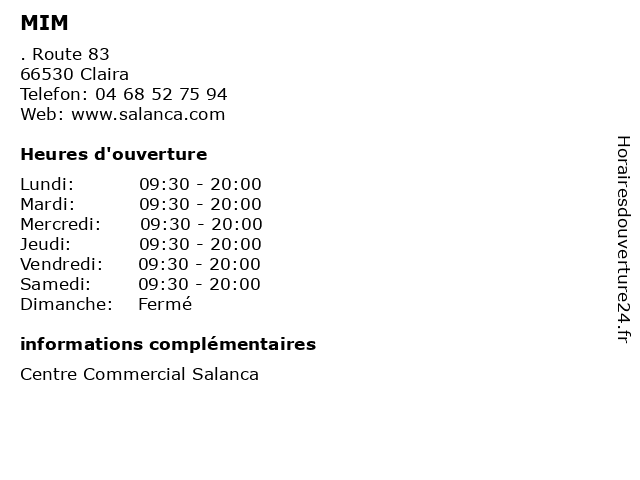1 Mim (Distance: 3,65 km) . De Barcares, 66531 Claire cafe, chaussures, enfants, homme, mim, mode femme, restaurant, sport 2 MIM (Distance: 3,98 km) . Route de Saint Jaume, 66530 Claira beaute, cafe, chaussures, enfants, hommes, lingerie, mim, mode femmes, restaurant, sport 3 MIM (Distance: 44,12 km) 23 Rue Desmoges, 11100 Narbonne accessoires, chaussures, hauts, lingerie, mim, pantalon 4 Carnet de Vol (Distance: 0,00 km) . Route 83, 66530 Claira cafe, carnet, chaussures, de, enfants, homme, lingerie, mode femme, restaurant, sport, vol 5 Coiffure du Monde (Distance: 0,00 km) . Route 83, 66530 Claira cafe, chaussures, coiffure, du, enfants, homme, lingerie, mode femme, monde, restaurant, sport 6 Darjeeling (Distance: 0,00 km) . Route 83, 66530 Claira cafe, chaussures, darjeeling, enfants, homme, lingerie, mode femme, restaurant, sport |