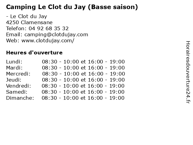 1 Camping Le Clot du Jay (Snack-Bar-Brasserie Basse Saison) (Distance: 0,00 km) - Le Clot du Jay, 04250 Clamensane bar, basse, brasserie, camping, caravaning, clot, du, en, jay, le, loisirs, saison, snack, tourisme, vacances 2 Camping Le Clot du Jay (Haute saison) (Distance: 0,00 km) - Le Clot du Jay, 04250 Clamensane accueil, camping, caravaning, clot, du, en, haute, jay, le, loisirs, saison, tourisme, vacances 3 Camping Le Clot du Jay (Snack-Bar-Brasserie Haute Saison) (Distance: 0,00 km) - Le Clot du Jay, 04250 Clamensane bar, brasserie, camping, caravaning, clot, du, en, haute, jay, le, loisirs, saison, snack, tourisme, vacances 4 Gîte Le Clot du Jay (Distance: 0,19 km) . Clot du Jay, 04250 Clamensane annuaire gîte, chambre, clot, du, gîte, jay, le, services 6 Dr Ivanne Jay - Médecin généraliste (Distance: 15,61 km) 3 Rue des Sapins, 05130 Tallard consultation, docteur, dr, généraliste, ivanne, jay, med, médecin, traitement |