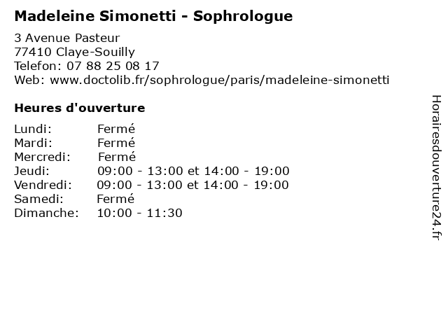 | Jeudi | 09:00-13:00 et 14:00-19:00 |
