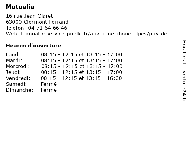2 MUTUALIA TERRITOIRES SOLIDAIRES (Distance: 0,82 km) 17 Allée Evariste Galois, 63170 Aubière mutualia, solidaires, territoires 3 Mutualité Sociale Agricole (Distance: 4,02 km) 75 Boulevard François-Mitterrand, 63972 Clermont Ferrand administration, agricole, assoc, mutualité, services, services publics, sociale 4 Camille Adamkiewicz - Orthoptiste (Distance: 5,16 km) 225 Boulevard Etienne Clémentel, 63100 Clermont-Ferrand adamkiewicz, camille, clermont-ferrand, mutualité, orthoptiste, traitement, troubles, visuels 5 Mutualité Française Allier (Distance: 46,10 km) 7 Rue du 11 Novembre, 03200 Vichy allier, française, mutualité 6 Mutualité Française Allier Ssam (Distance: 48,17 km) Place Robert Chopard, 03110 Charmeil allier, française, mutualité, ssam |